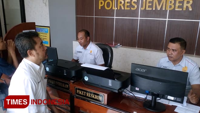 TIMES Sidoarjo/Wakil Ketua Bidang Litbang dan IT DPD Partai Perindo Kebupaten Jember, Ahmad One Prastiono saat melaporkan Ketua DPD Partai Perindo Kabupaten Jember Hanung Prijobodo ke Polres Jember, Senin (6/5/2019). (FOTO: Dody Bayu/TIMES Indonesia)